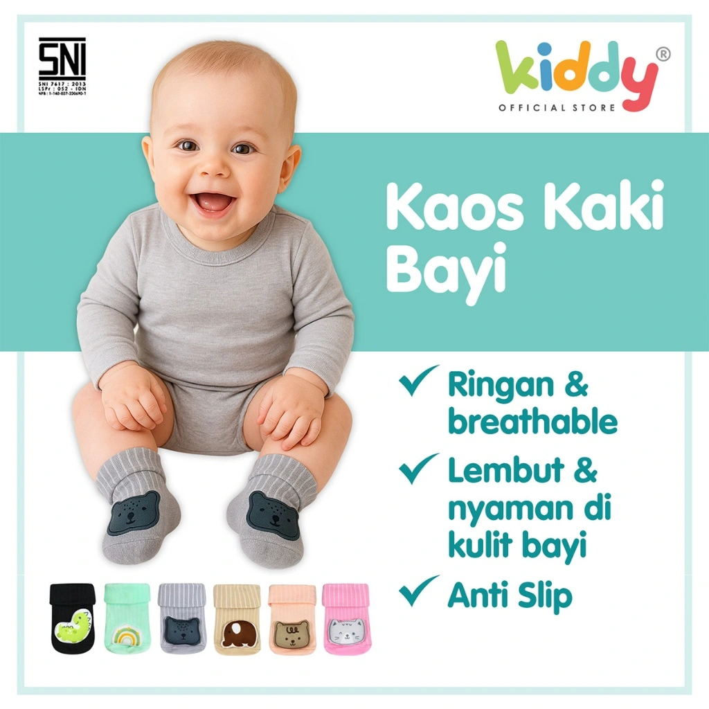 Kaos kaki berbahan katun dengan aplikasi boneka. Terdapat anti slip di bagian bawah kaos kaki untuk mencegah anak tergelincir.